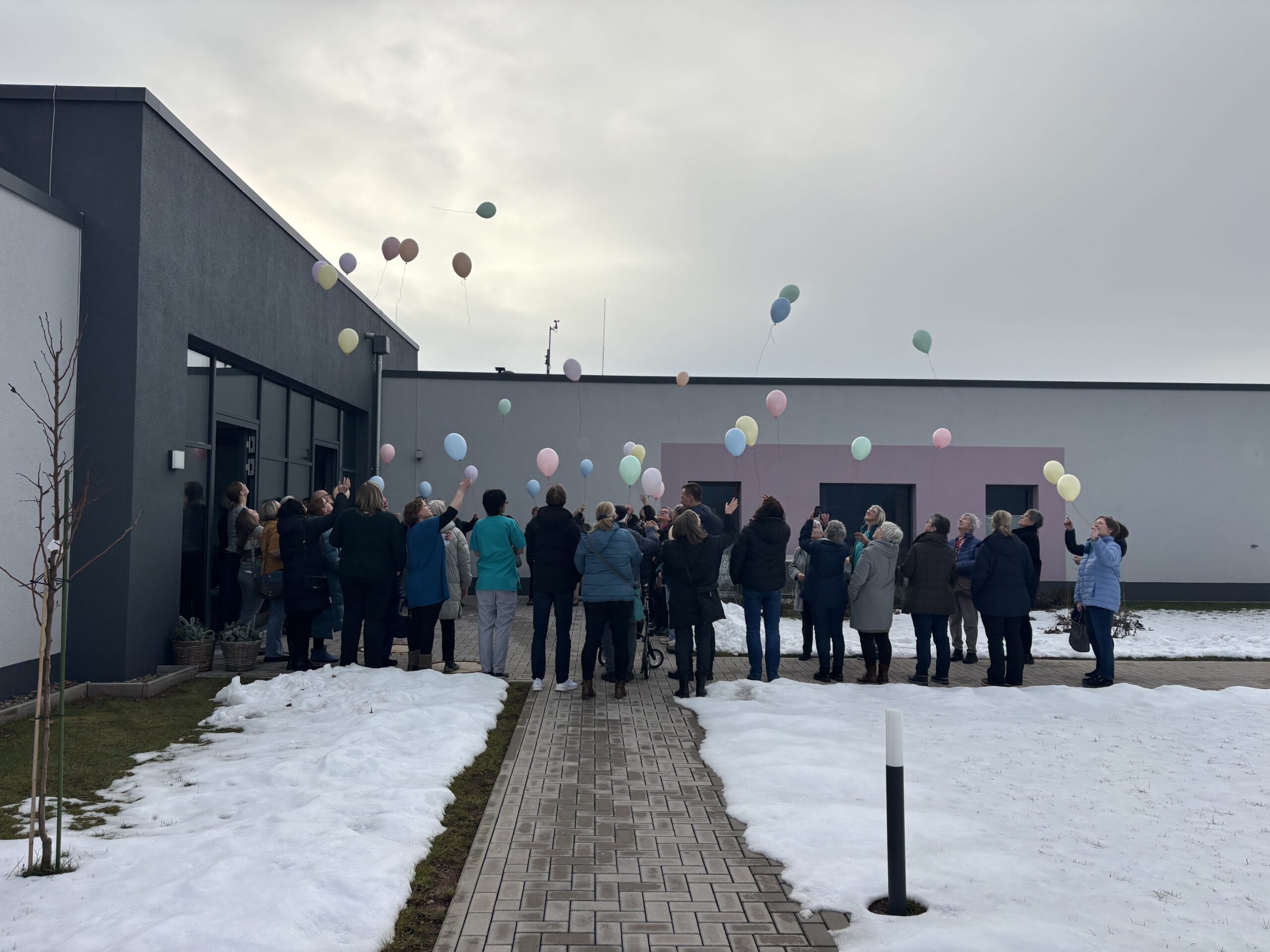 Um die Verstorbenen dennoch auf eine besondere Weise loszulassen, wurden von den Hinterbliebenen Luftballons in den Himmel entlassen. Die pastellfarbenen Luftballons stiegen in die Höhe und flogen weit hinaus in die weiße Winterlandschaft.